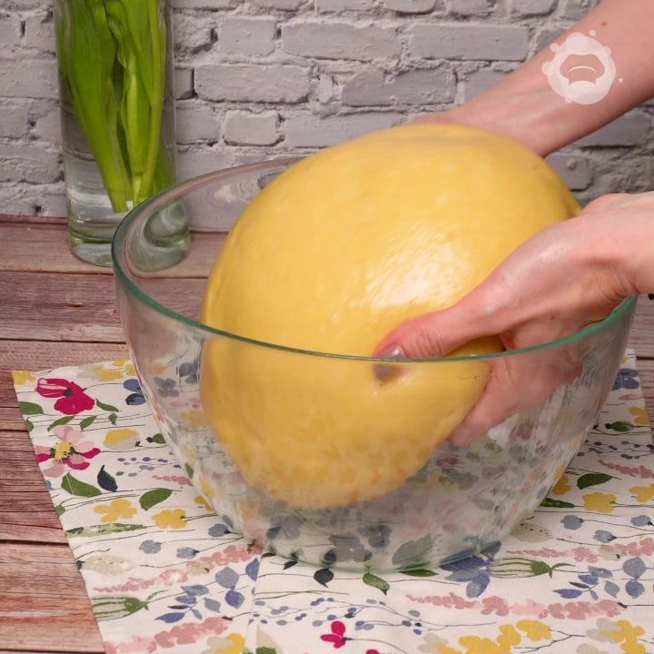 - Gălbenușurile le mixăm cu sarea, zahărul și adăugăm iaurtul și aromele. Cernem făina și amestecăm cu maiaua crescută și amestecul de gălbenușuri, frământăm și apoi adăugăm untul la temperatura camerei, câte puțin. Aluatul îl lăsăm la dospit într-un vas uns cu ulei.