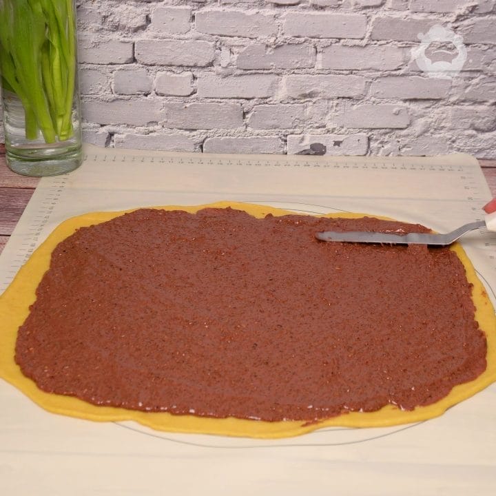 - După ce aluatul a crescut, îl împărțim în 4 bucăți. Întindem aluatul, punem crema și rulăm. Lăsăm la crescut o oră, ungem cozonacii cu gălbenuș de ou și presărăm zahăr brun și nucă.