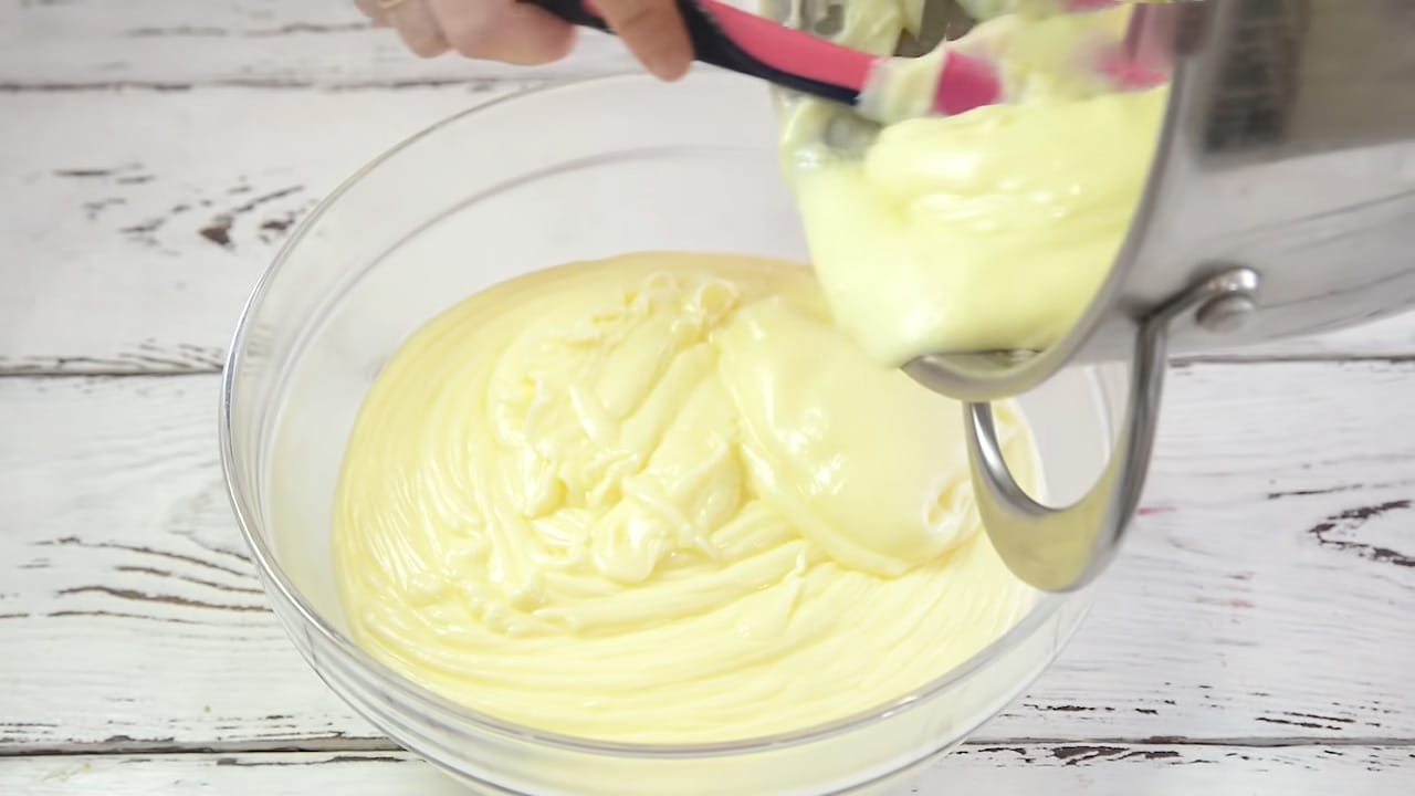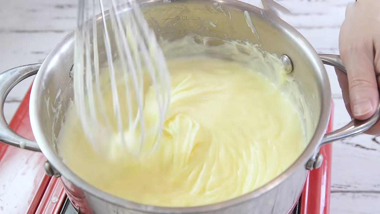 Amestecăm ouăle cu zahărul și zahărul vanilat până se omogenizează, apoi adăugăm amidonul și smântâna. Fierbem compoziția la foc mic, amestecând continuu, până se îngroașă și capătă consistența unei budinci.