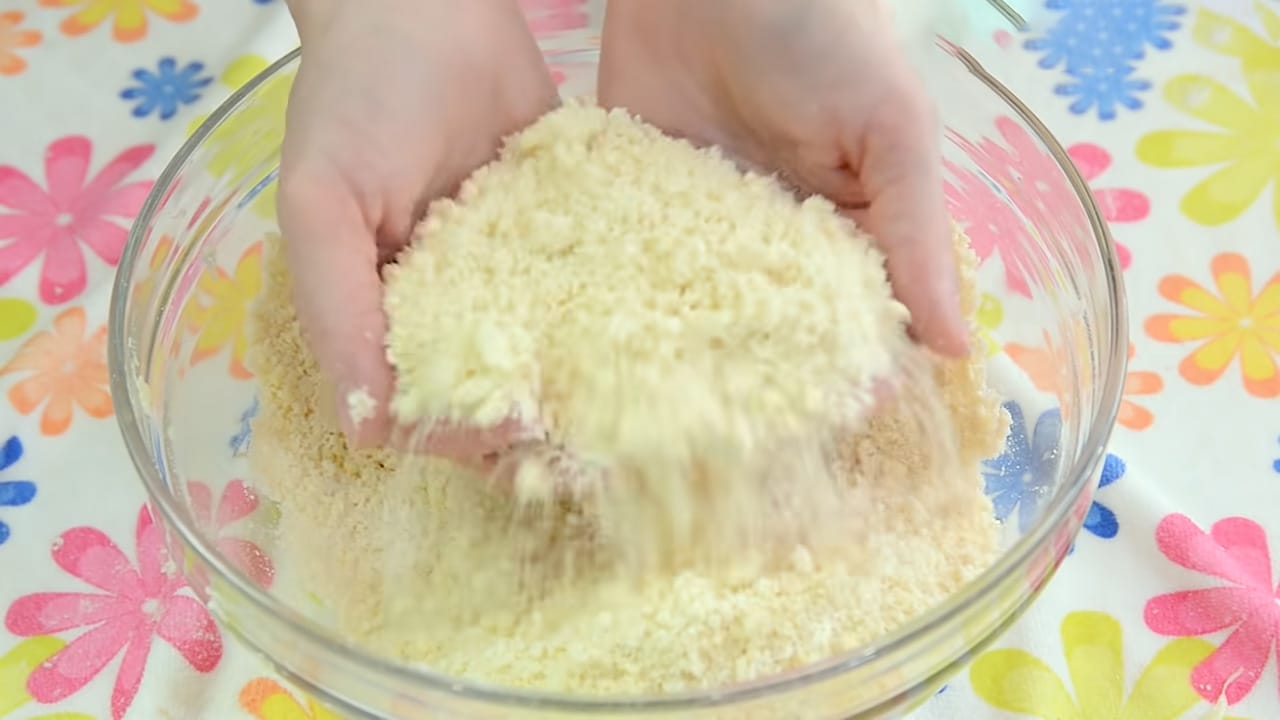 Pentru crumble, amestecăm făina cu zahărul și untul până obținem o compoziție nisipoasă.