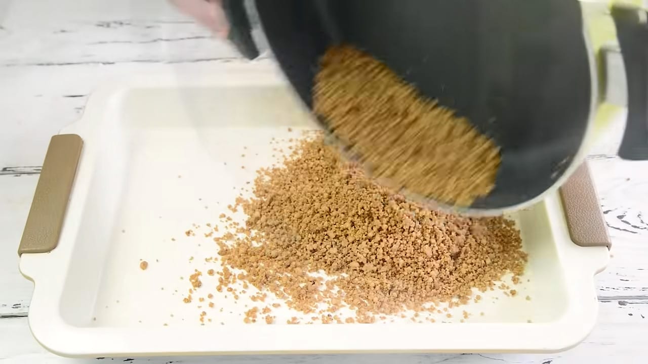 Punem compoziția într-o tigaie uscată și o gătim la foc mediu, amestecând constant, până devine aurie și crocantă. O lăsăm să se răcească complet.