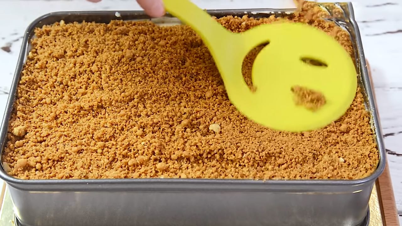 Într-o formă, alternăm straturi de crumble și cremă, terminând cu un strat de crumble.